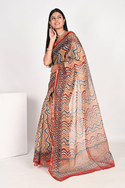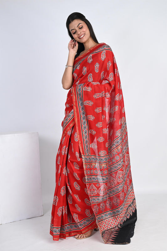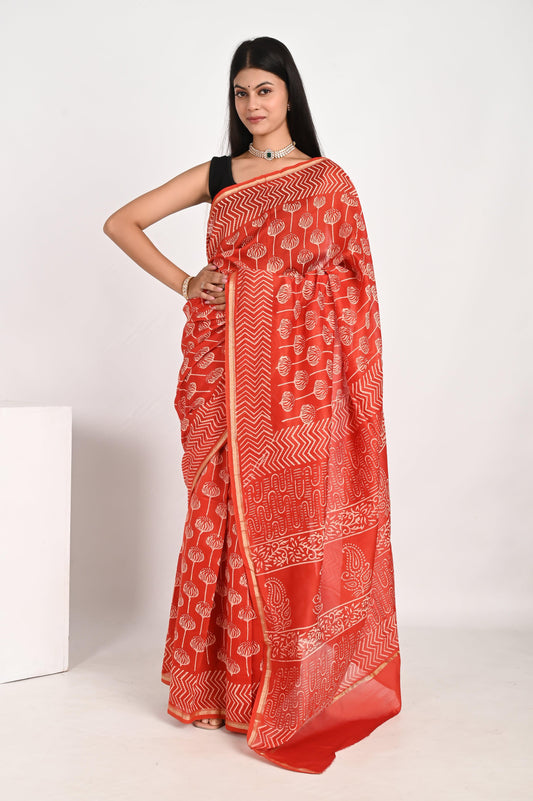 Hand Block Printed Blushing Red Chanderi Silk Saree