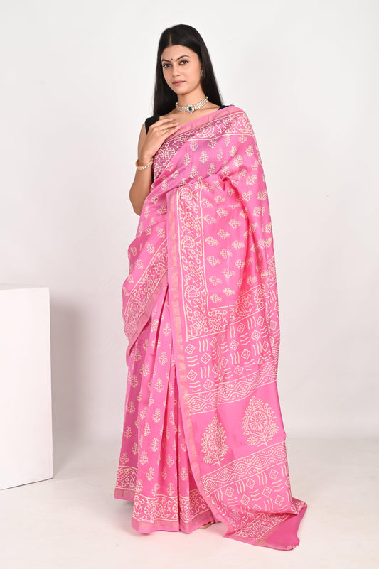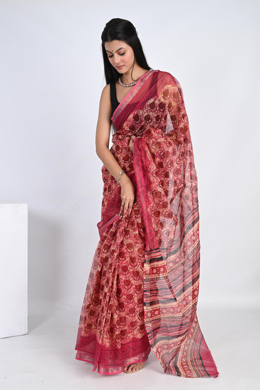 Pinkish Red Hand Block Printed Kota Doria Saree