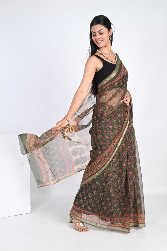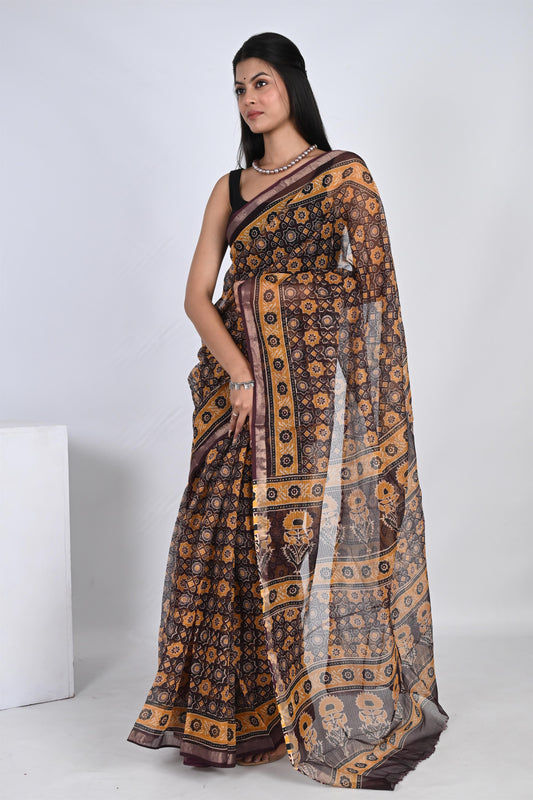 Coffee Brown Hand Block Printed Kota Doria Saree