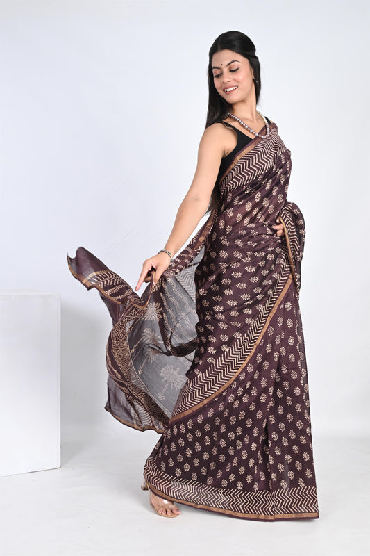 Hand Block Printed Coffee Brown Chanderi Silk Saree
