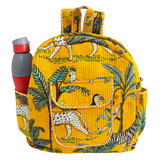 The Jungle Book Edition:- Premium Quilted Yellow Cotton Backpack with Animal Print Design - Stylish Eco-Friendly Bag for School, Travel, and Everyday Adventures