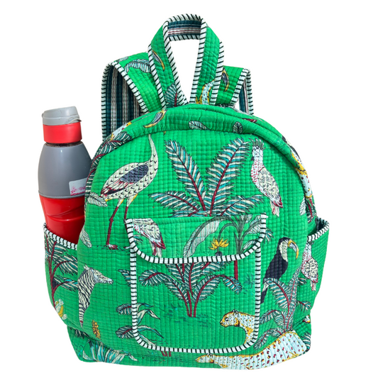 The Jungle Book Edition:- Premium Quilted Green Cotton Backpack with Animal Print Design - Stylish Eco-Friendly Bag for School, Travel, and Everyday Adventures