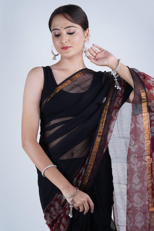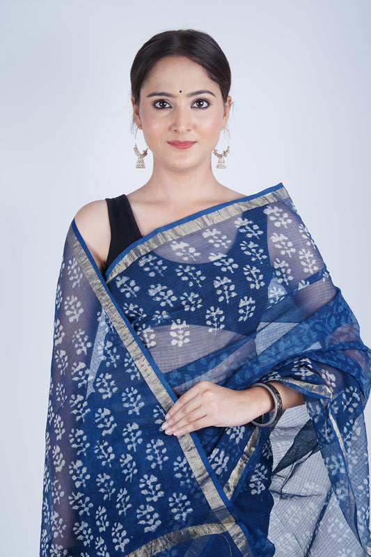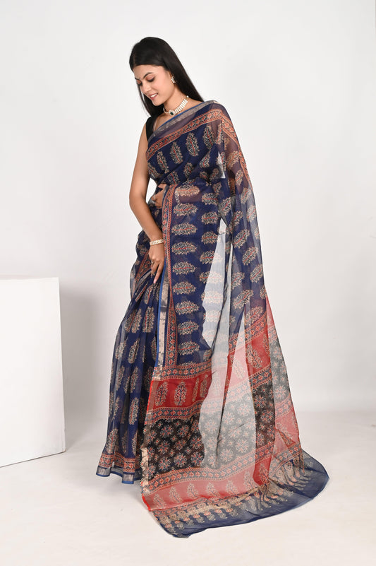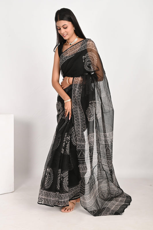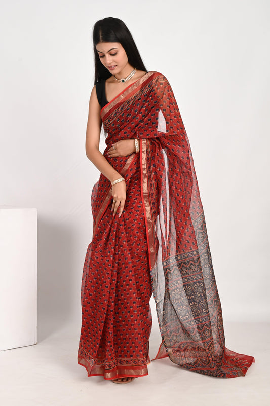 Coffee Brown Hand Block Printed Kota Doria Saree