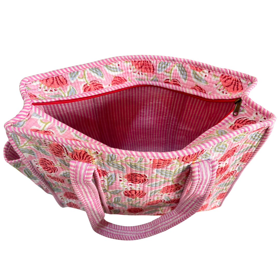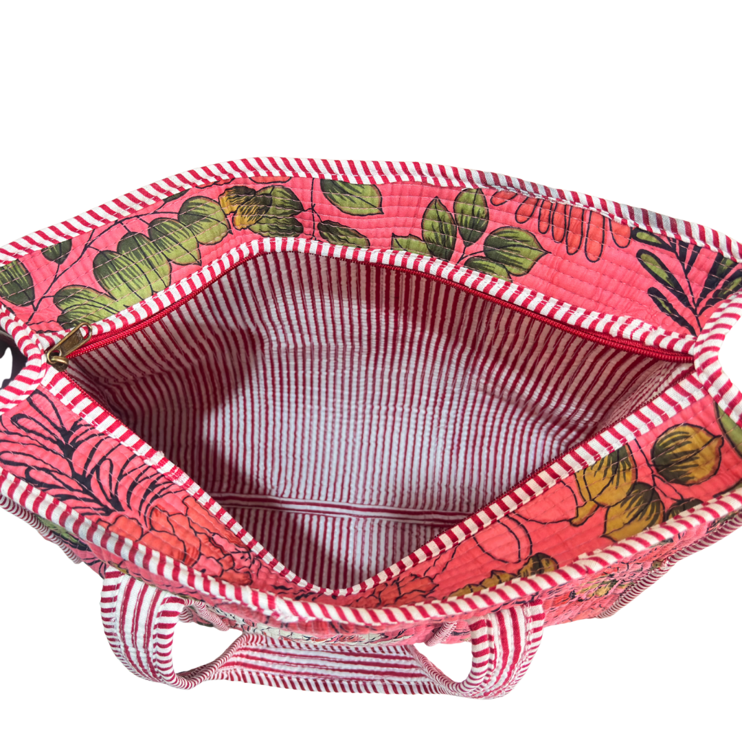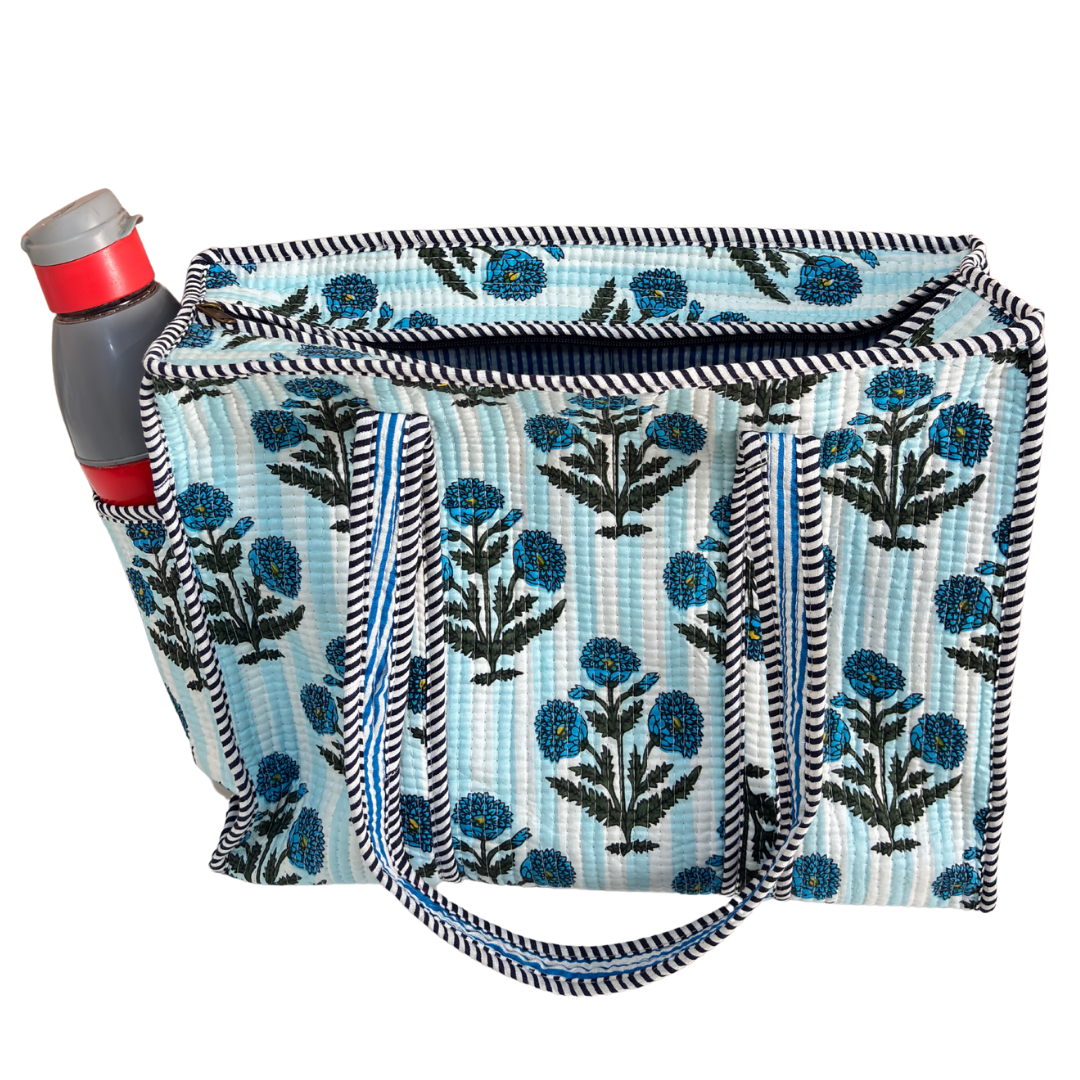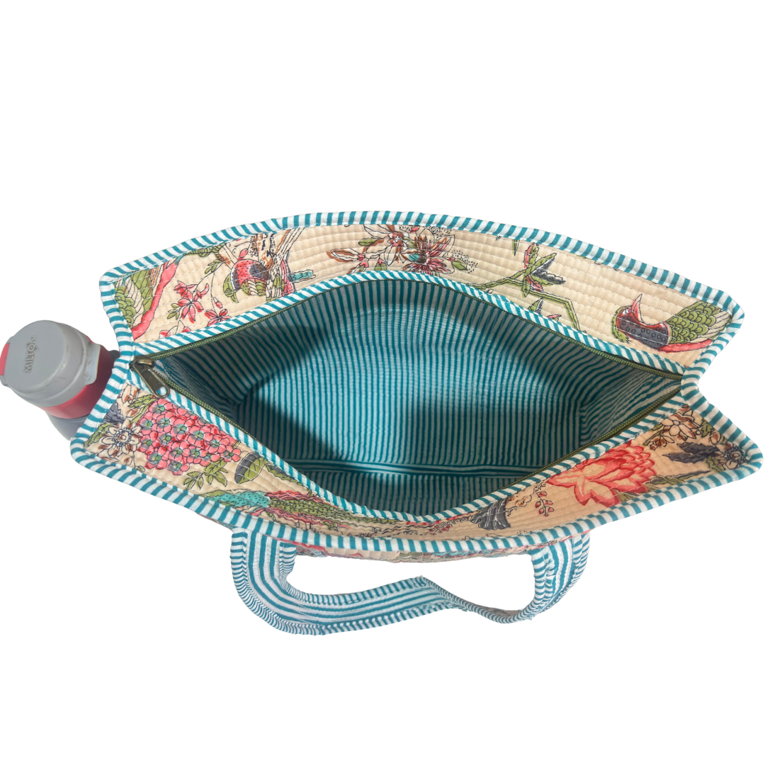 Design Features: Beautiful floral quilted cotton tote bag with striped trim detailing and convenient external bottle pocket for easy access