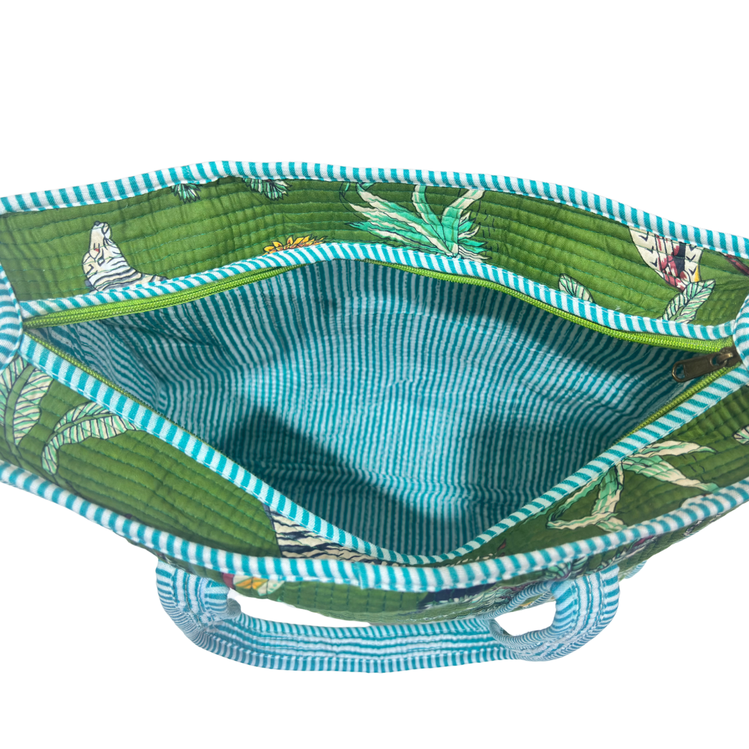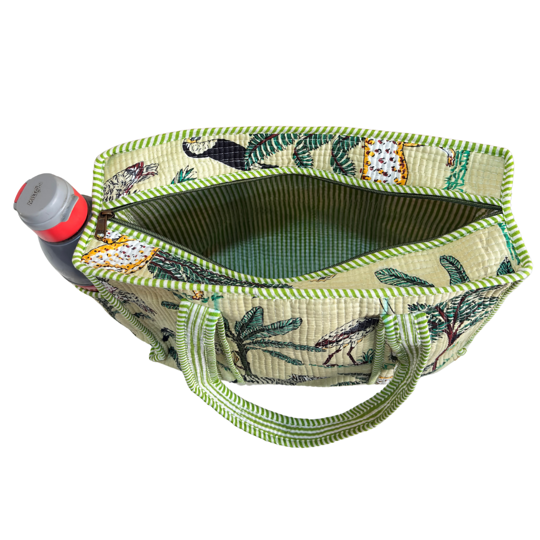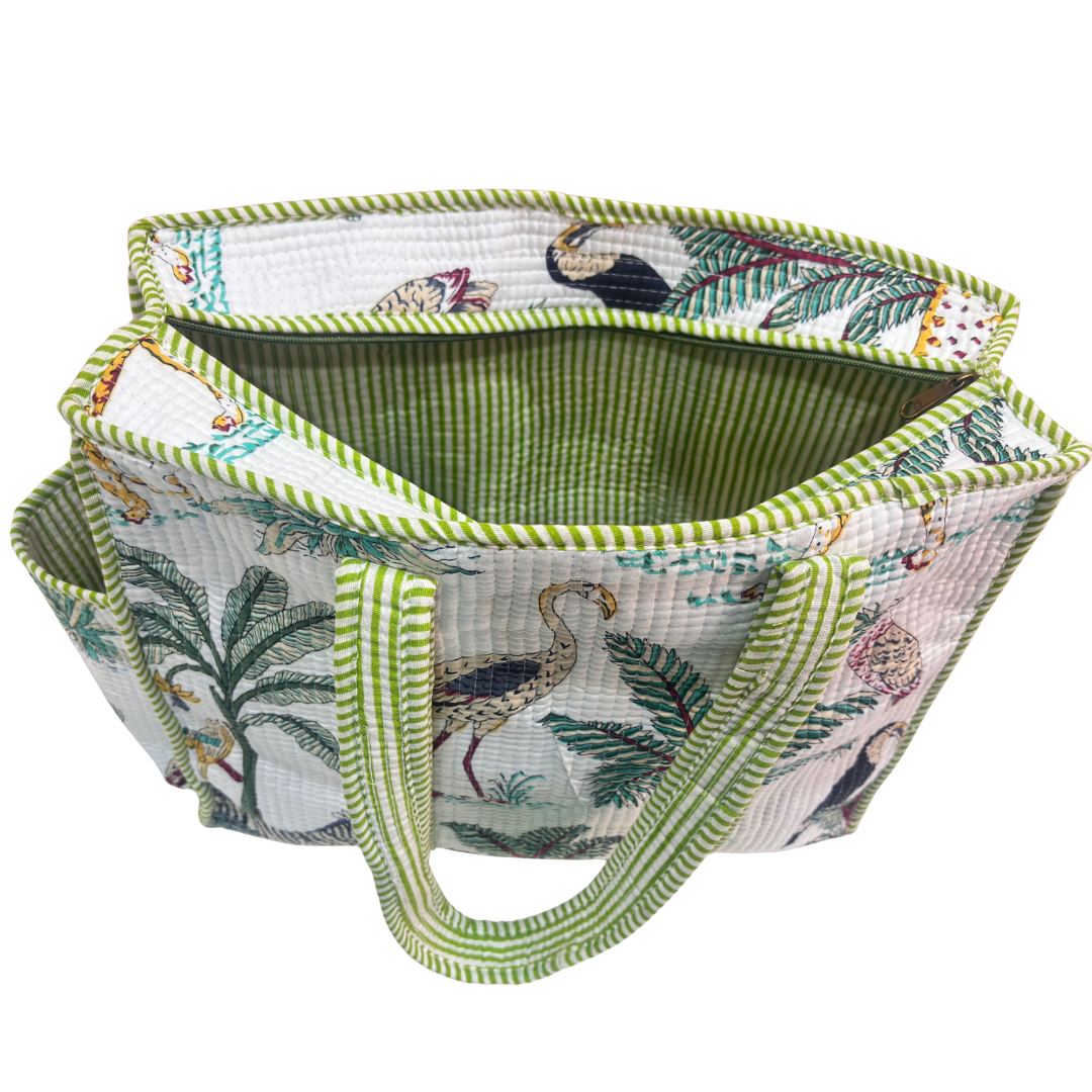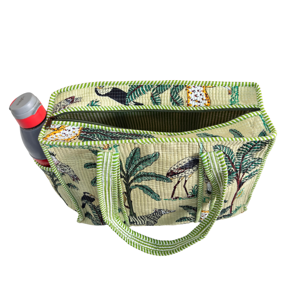 Design Features: Beautiful floral quilted cotton tote bag with striped trim detailing and convenient external bottle pocket for easy access