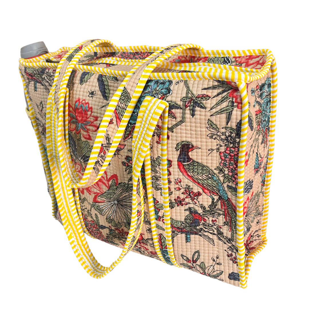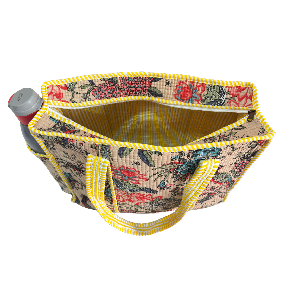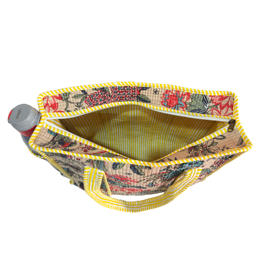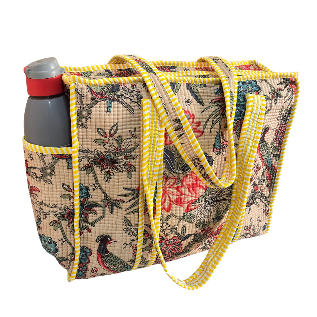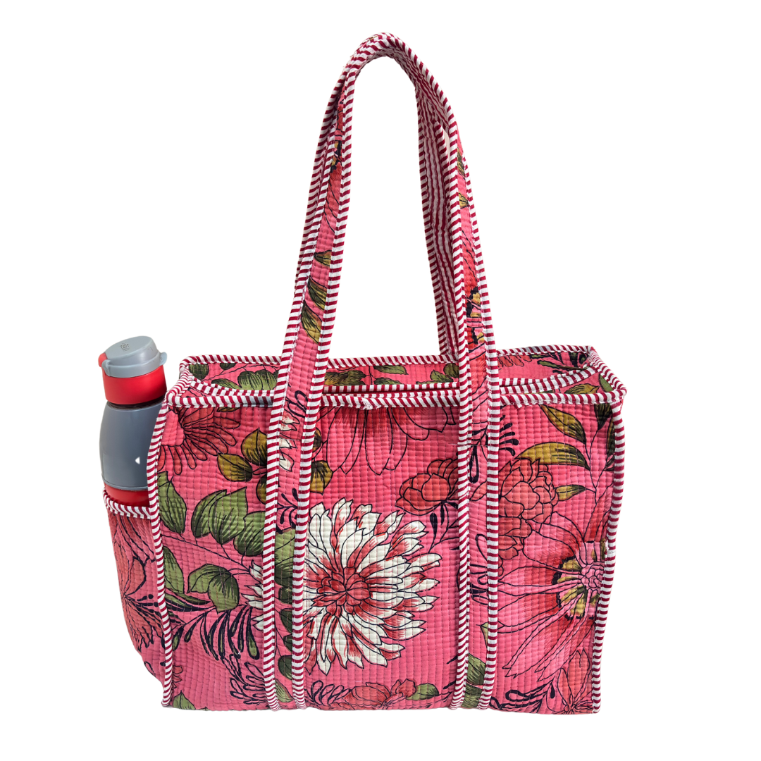 Design Features: Beautiful floral quilted cotton tote bag with striped trim detailing and convenient external bottle pocket for easy access