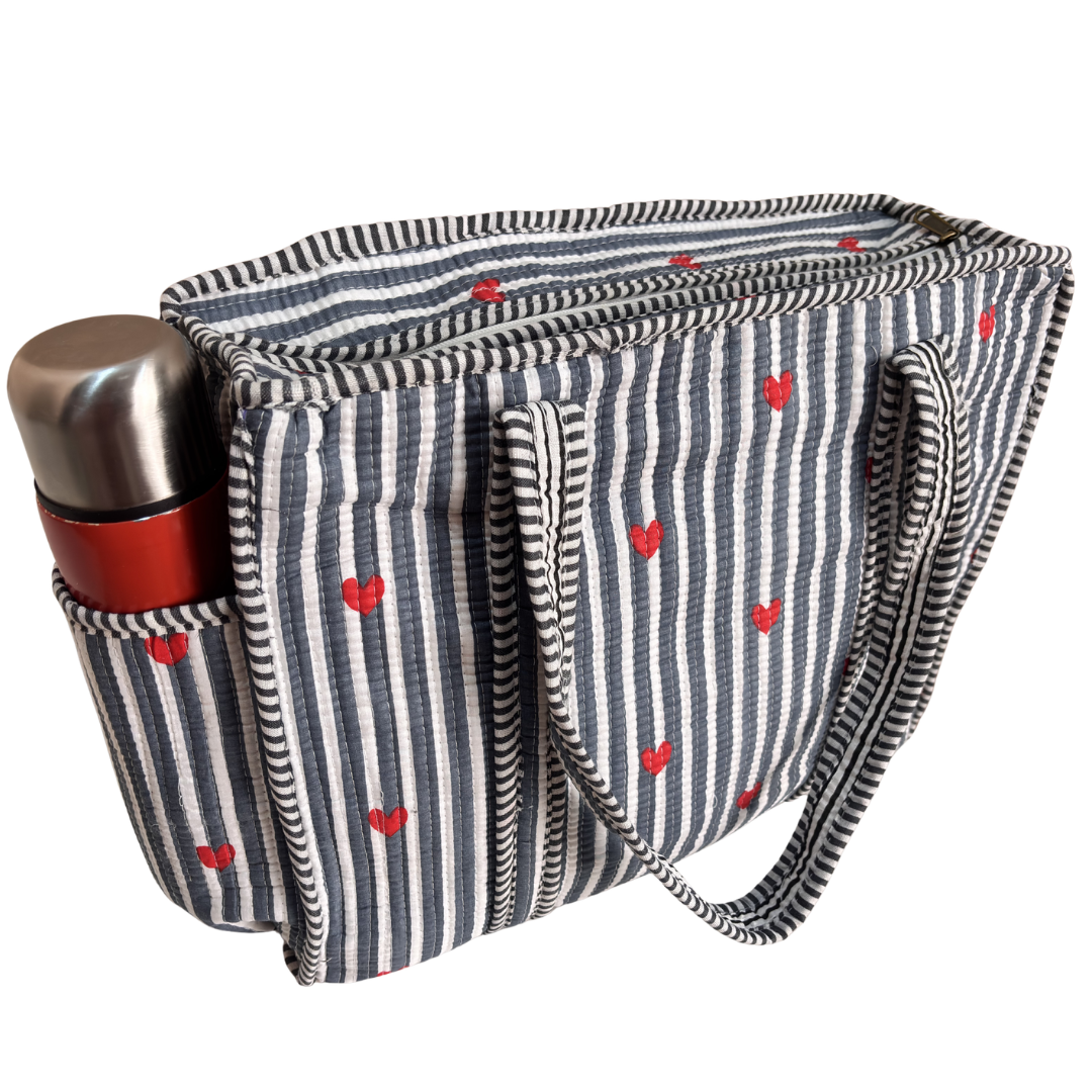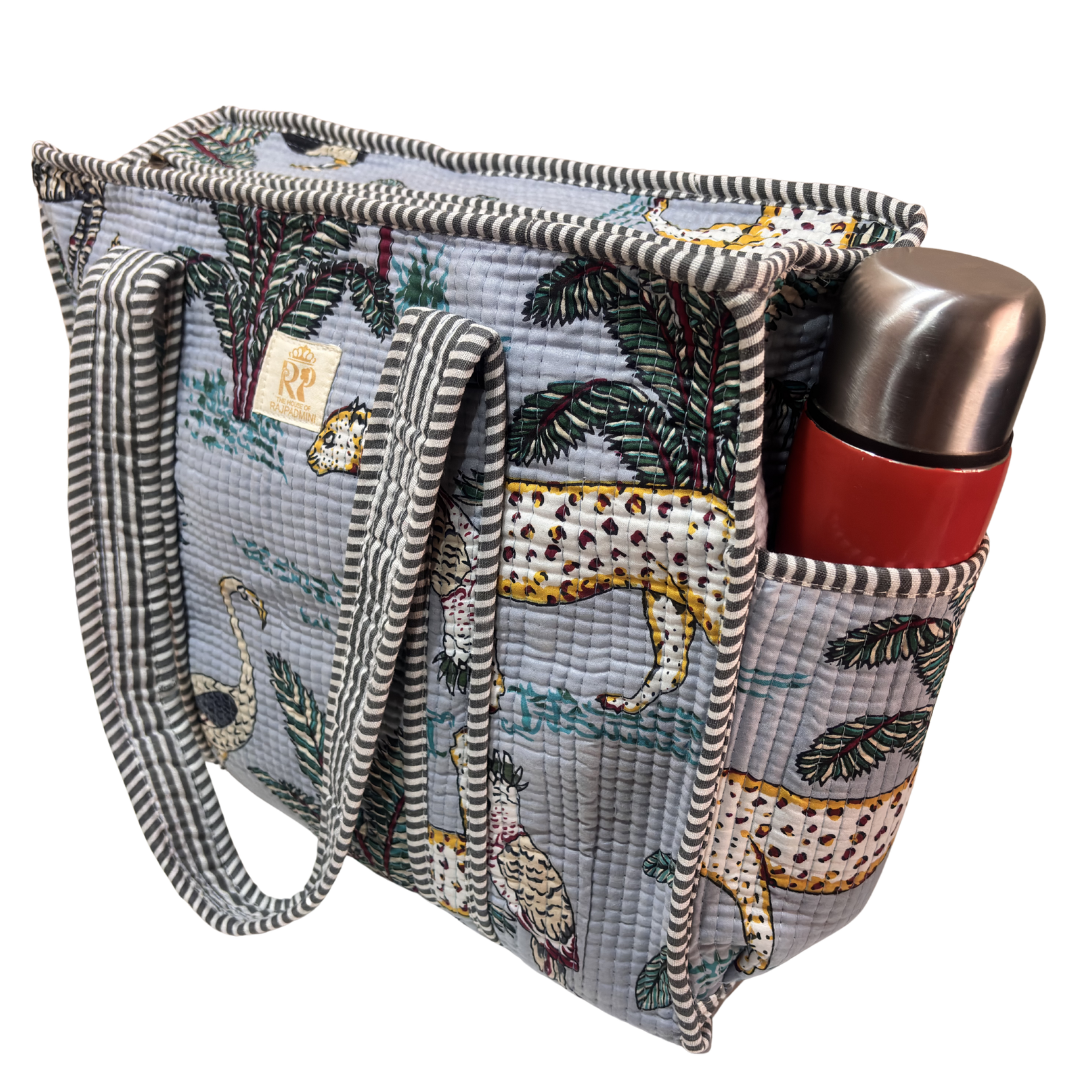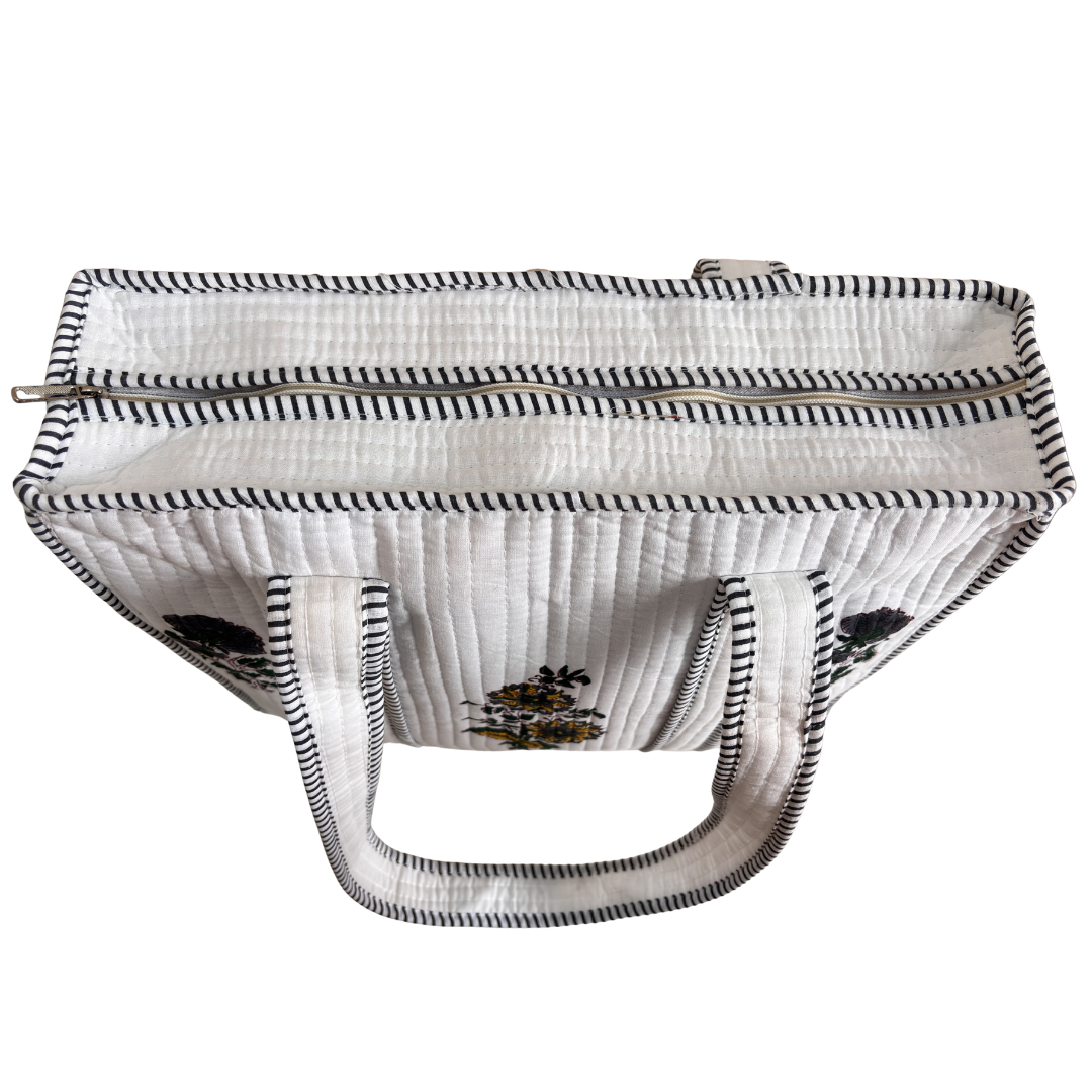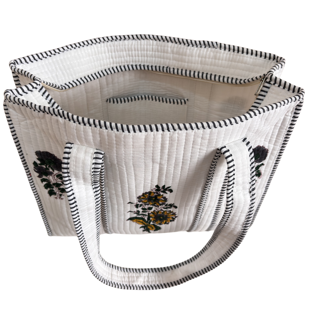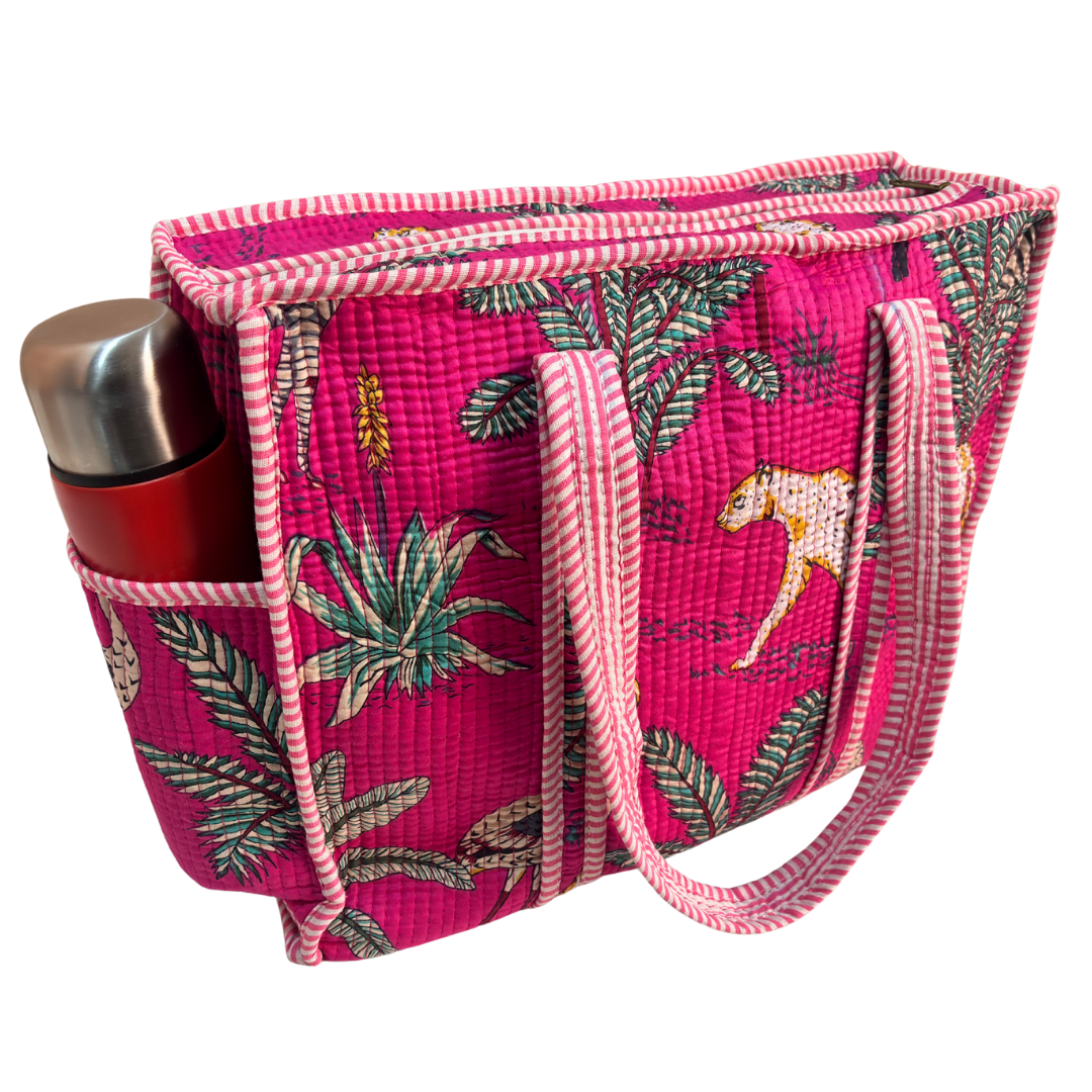 Design Features: Beautiful floral quilted cotton tote bag with striped trim detailing and convenient external bottle pocket for easy access