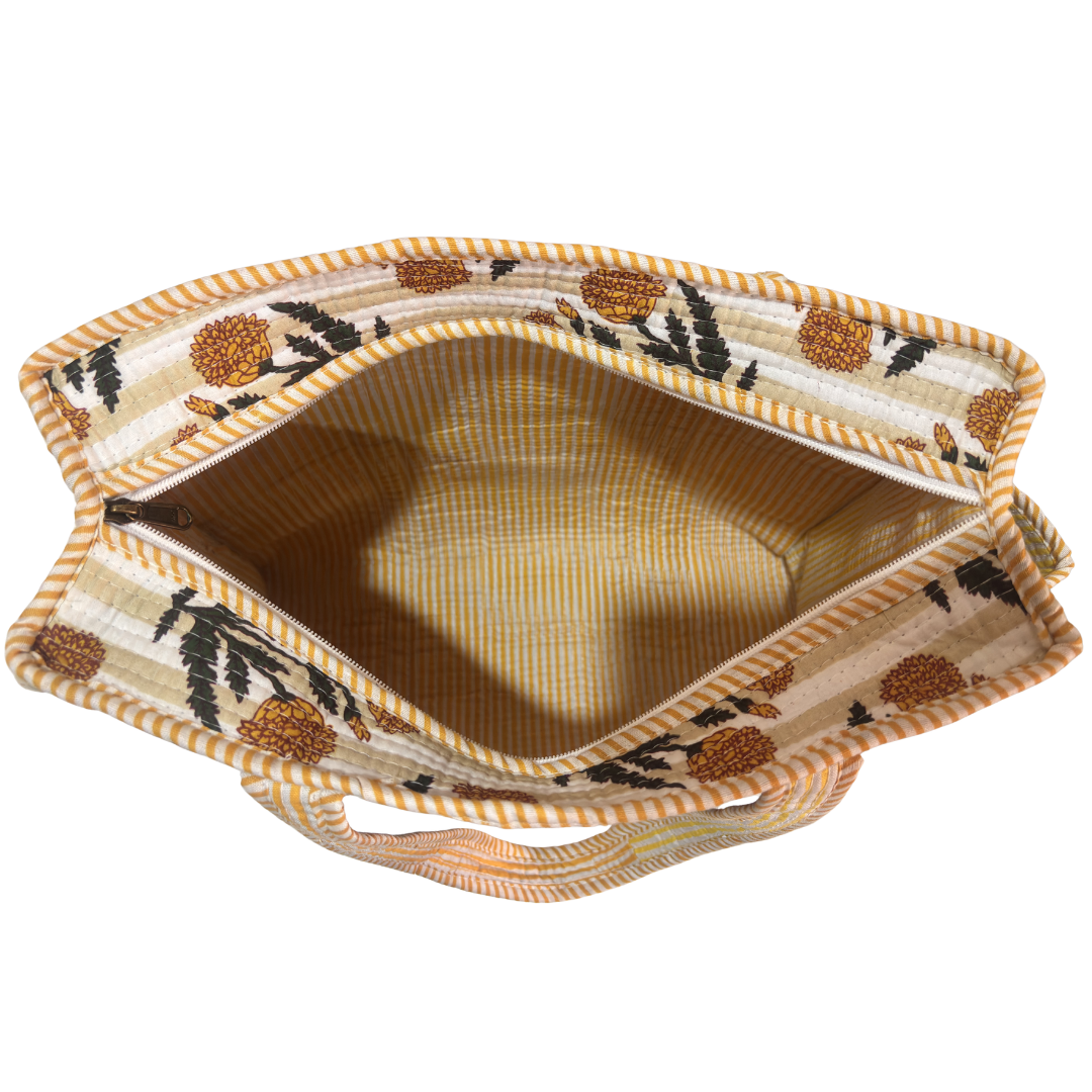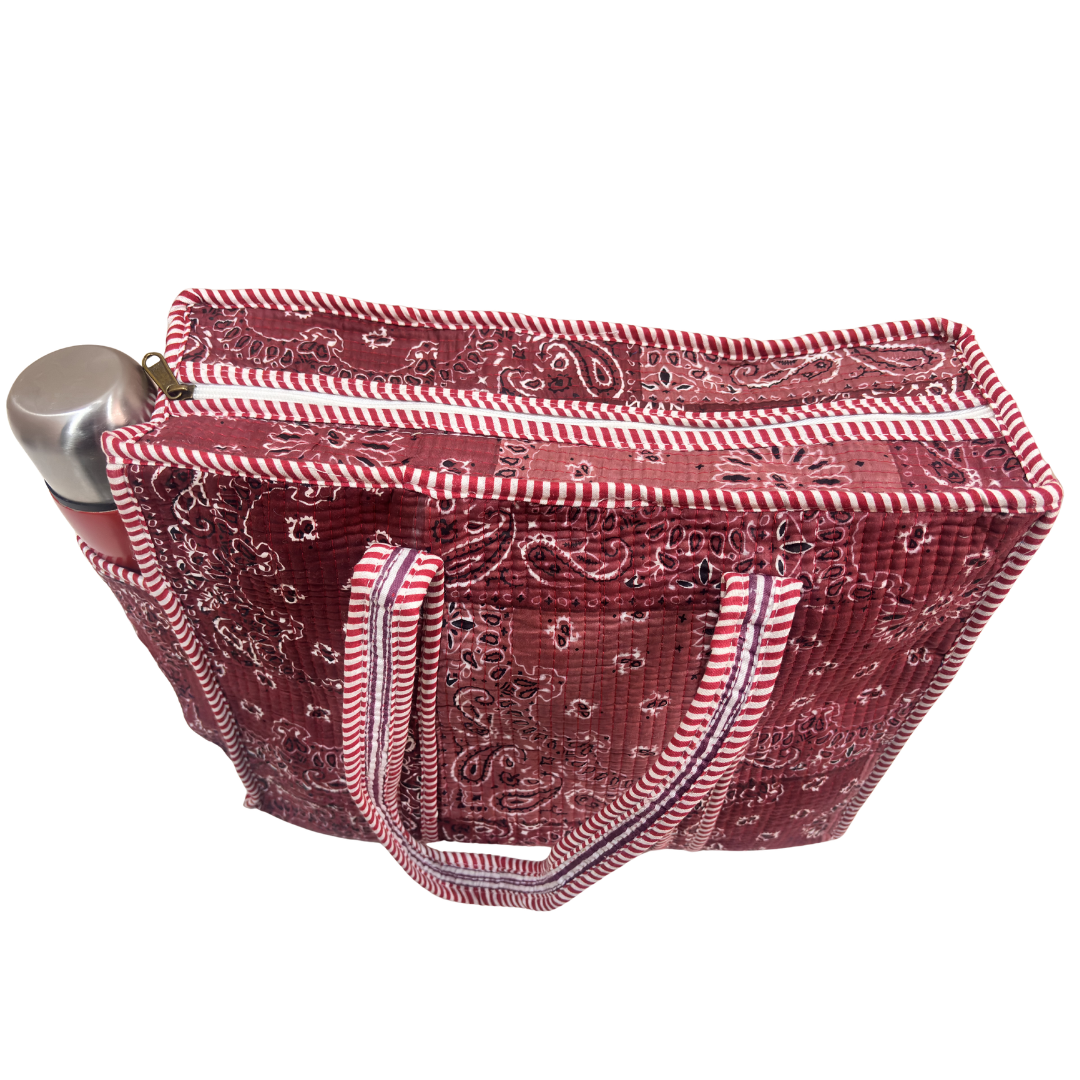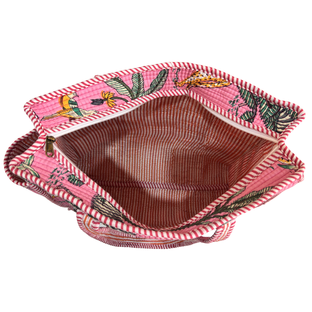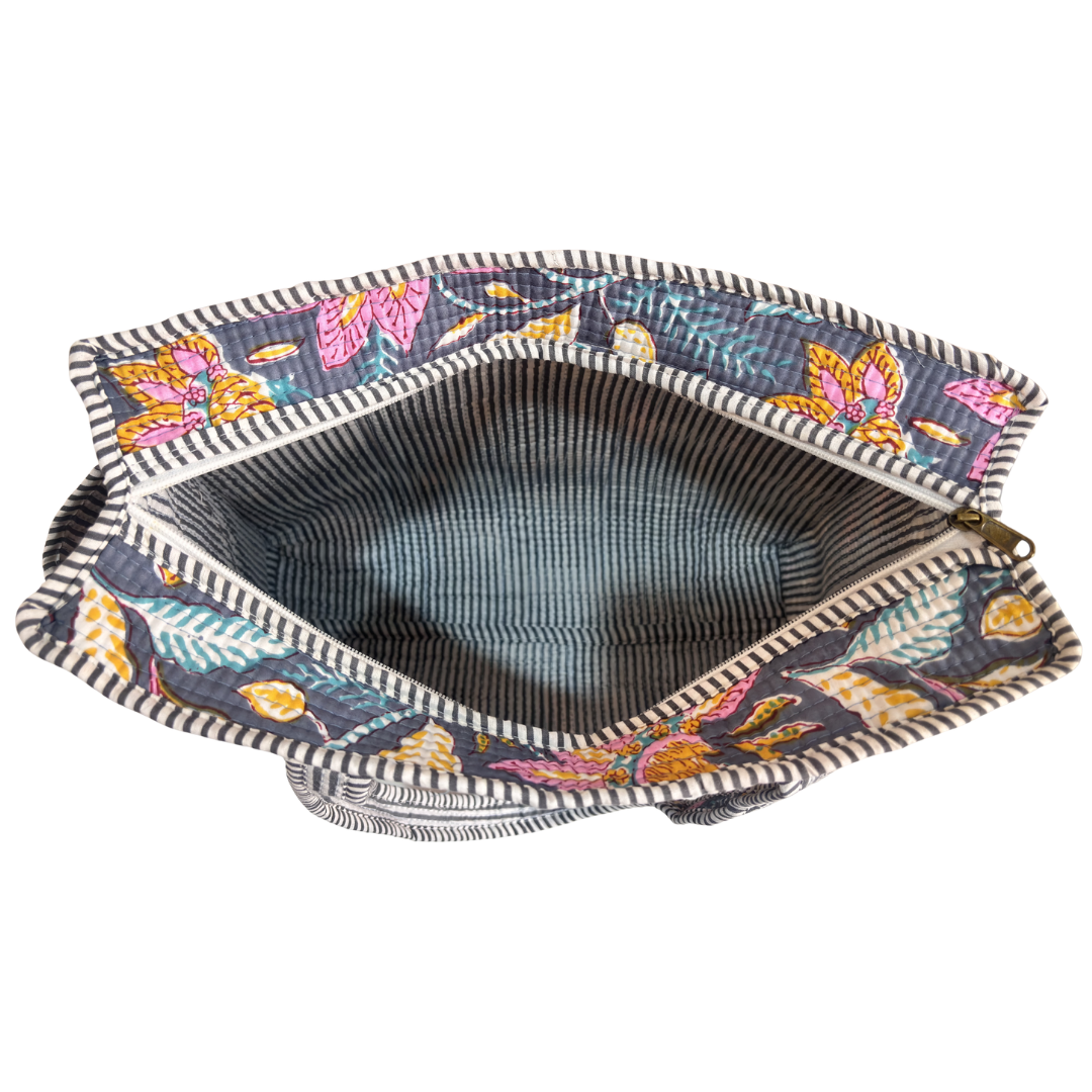Design Features: Beautiful floral quilted cotton tote bag with striped trim detailing and convenient external bottle pocket for easy access