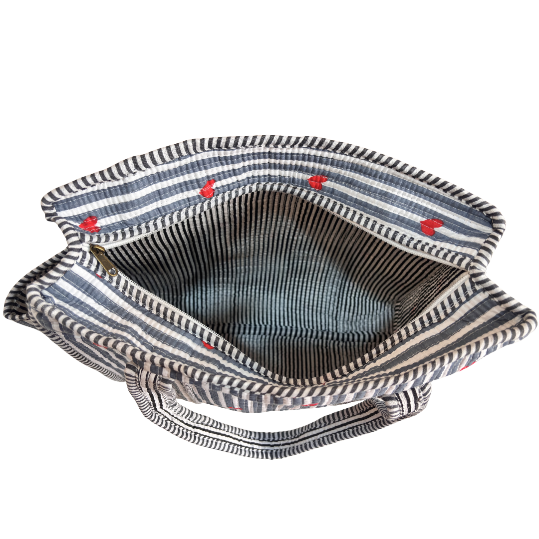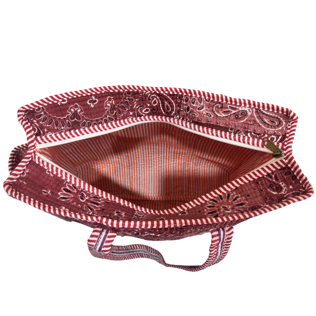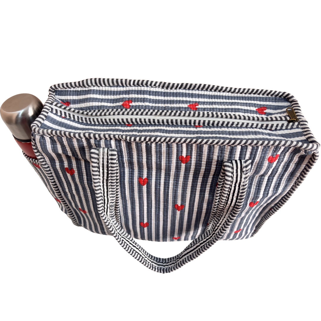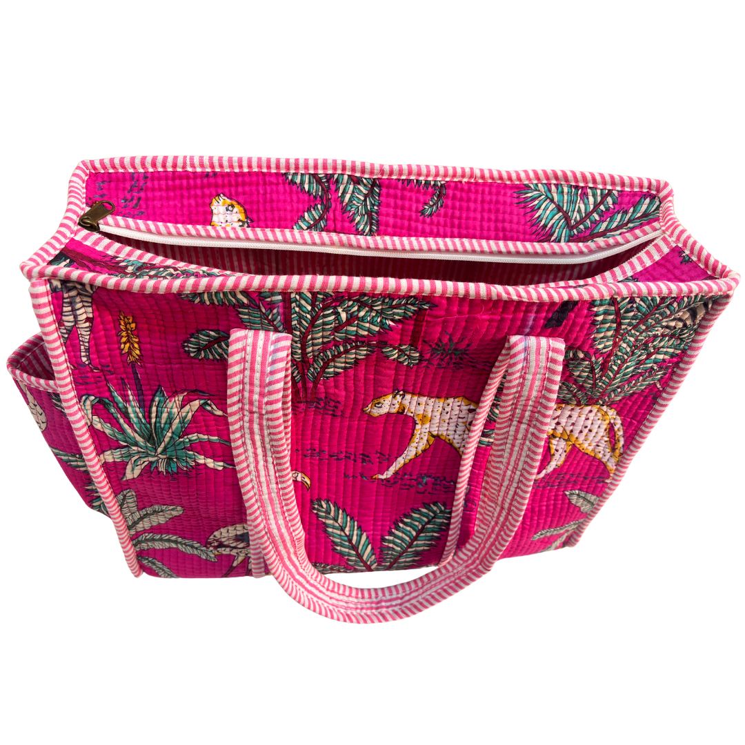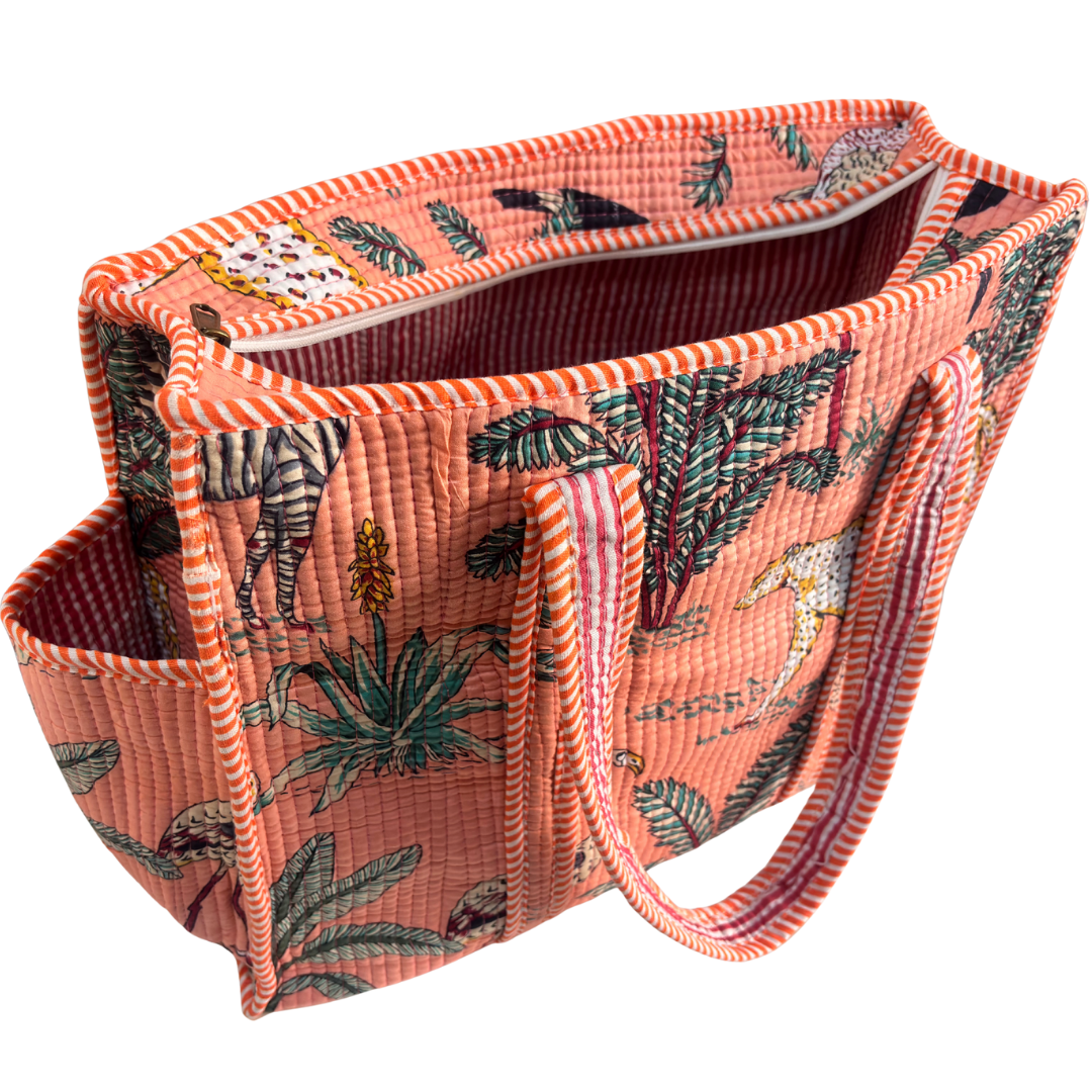 Design Features: Beautiful floral quilted cotton tote bag with striped trim detailing and convenient external bottle pocket for easy access
