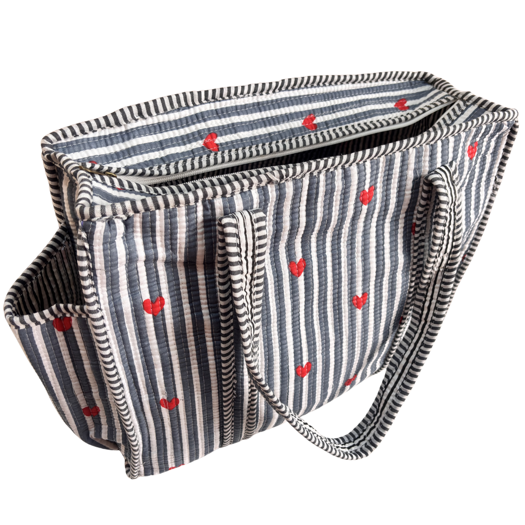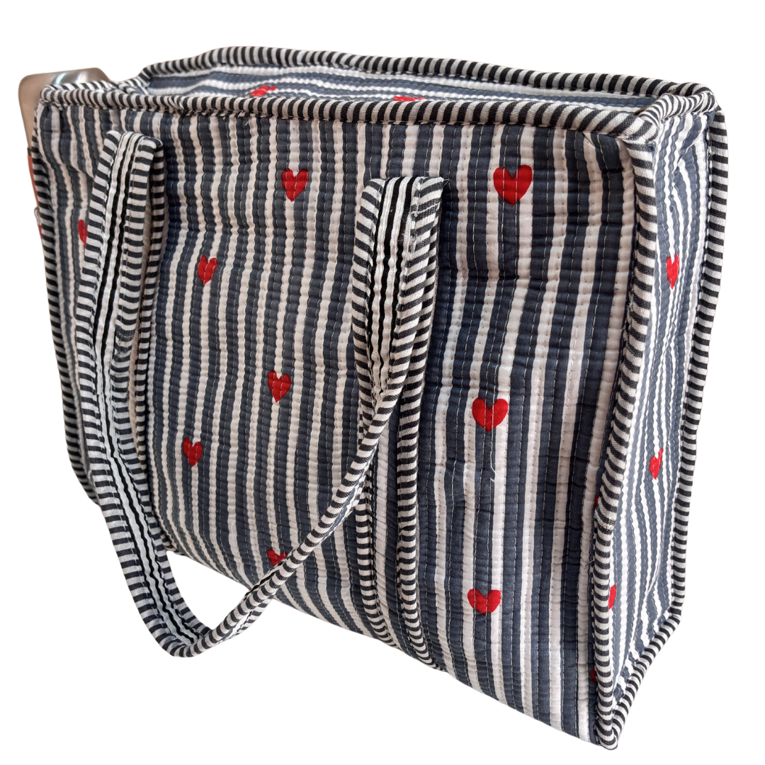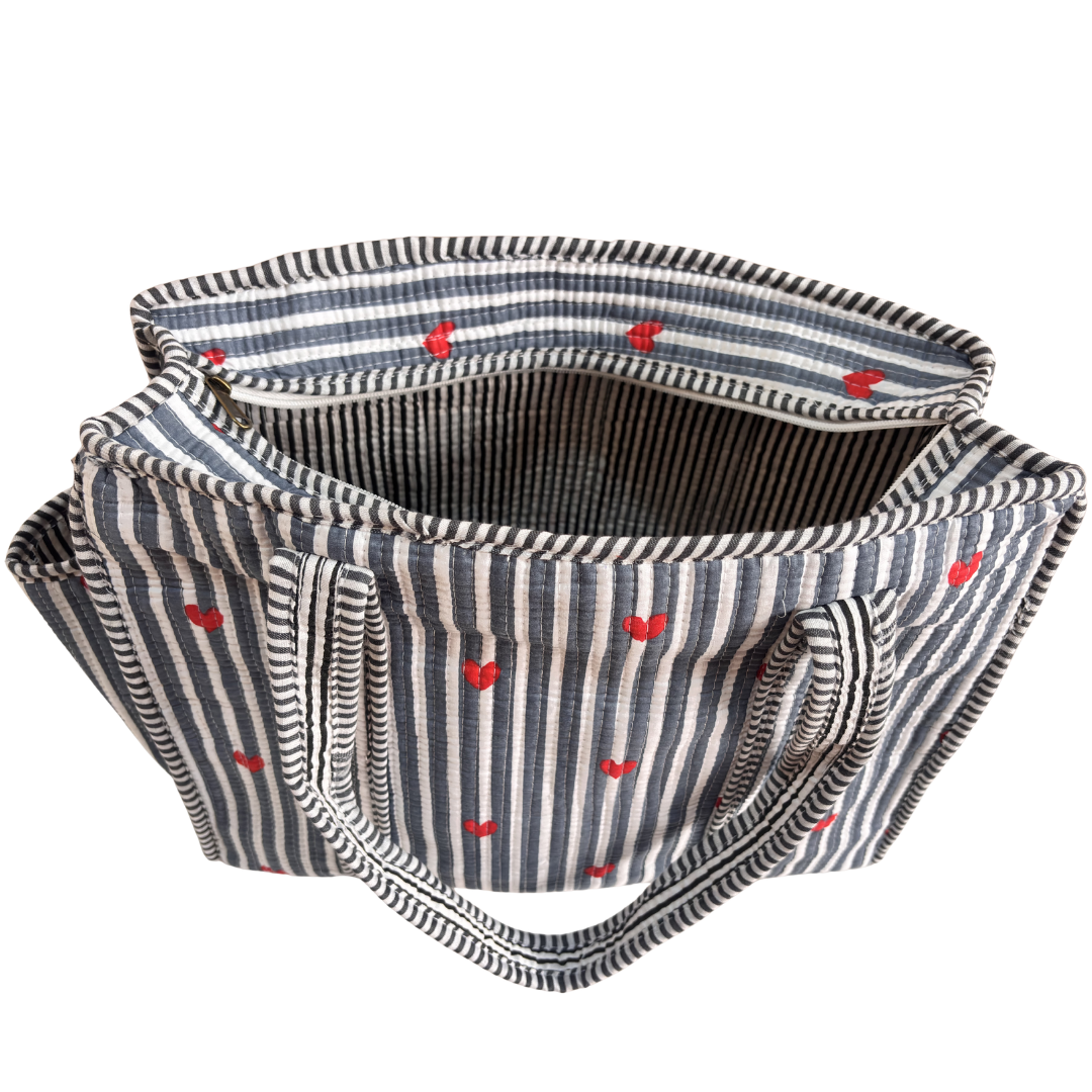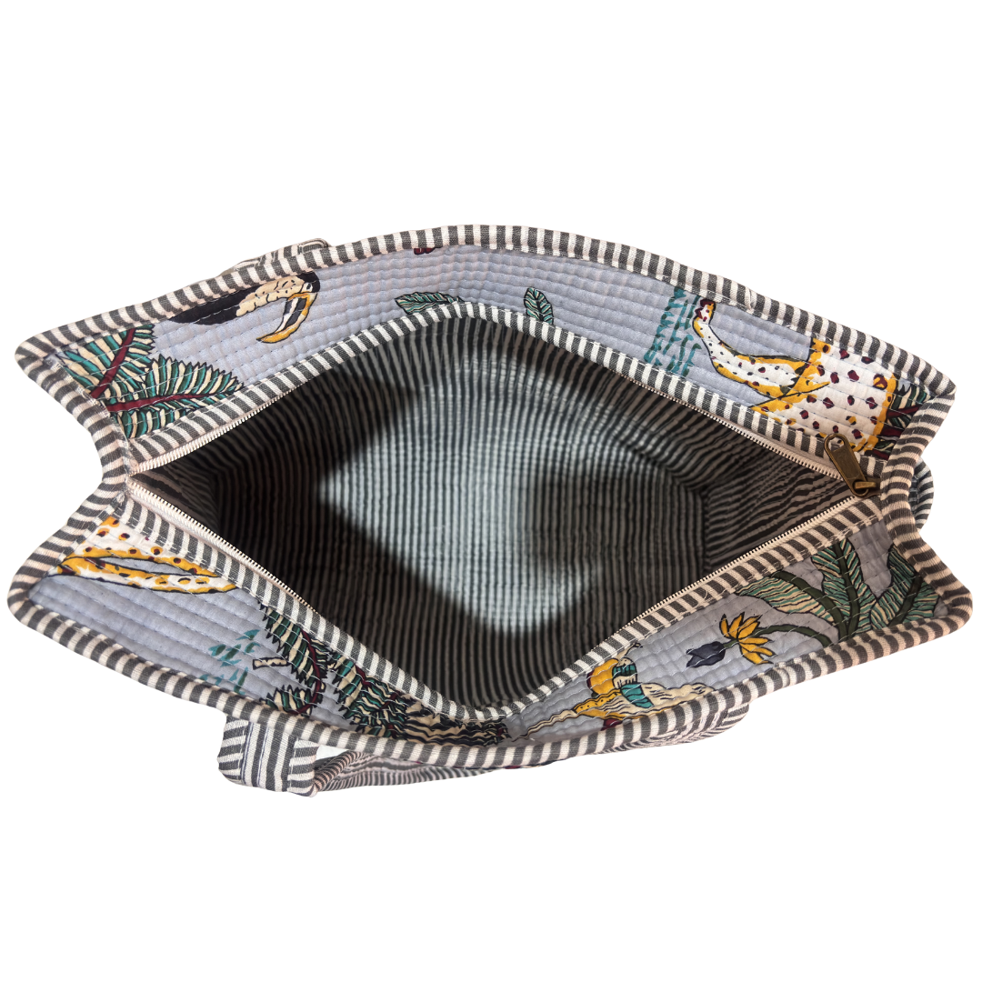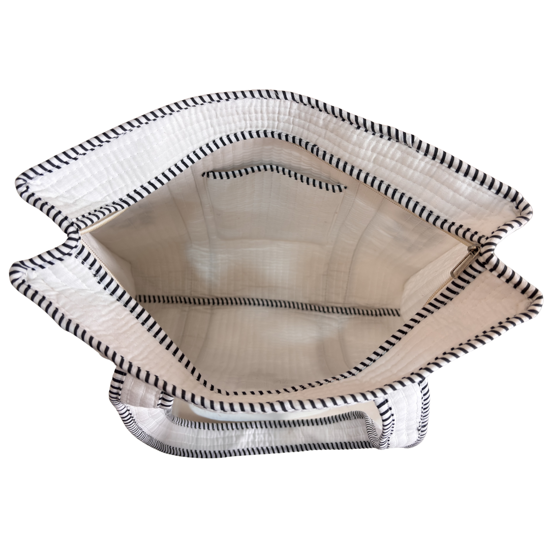 Design Features: Beautiful floral quilted cotton tote bag with striped trim detailing and convenient external bottle pocket for easy access