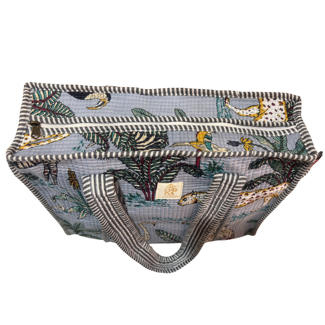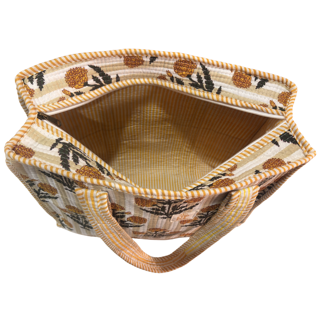Discover the perfect blend of style and functionality with this charming quilted cotton shopping tote bag. Measuring 40.6 x 40.6 centimetres, this versatile tote features beautiful floral prints in various colour options including navy, mint, and mustard, each adorned with contrasting striped trim detailing. The quilted cotton construction ensures durability while keeping the bag remarkably lightweight and easy to carry. A thoughtfully designed external bottle pocket adds practical convenience for your beverages on the go. The bag's spacious interior provides ample room for your shopping essentials, making it ideal for grocery runs, picnics, or casual outings. Both hand and machine washable, this tote offers easy maintenance for long-lasting use. The distinctive striped trim adds a playful touch to the elegant floral patterns, creating a perfect accessory for daily use. Whether you're heading to the market or running errands, this tote combines practicality with aesthetic appeal in a delightful package.