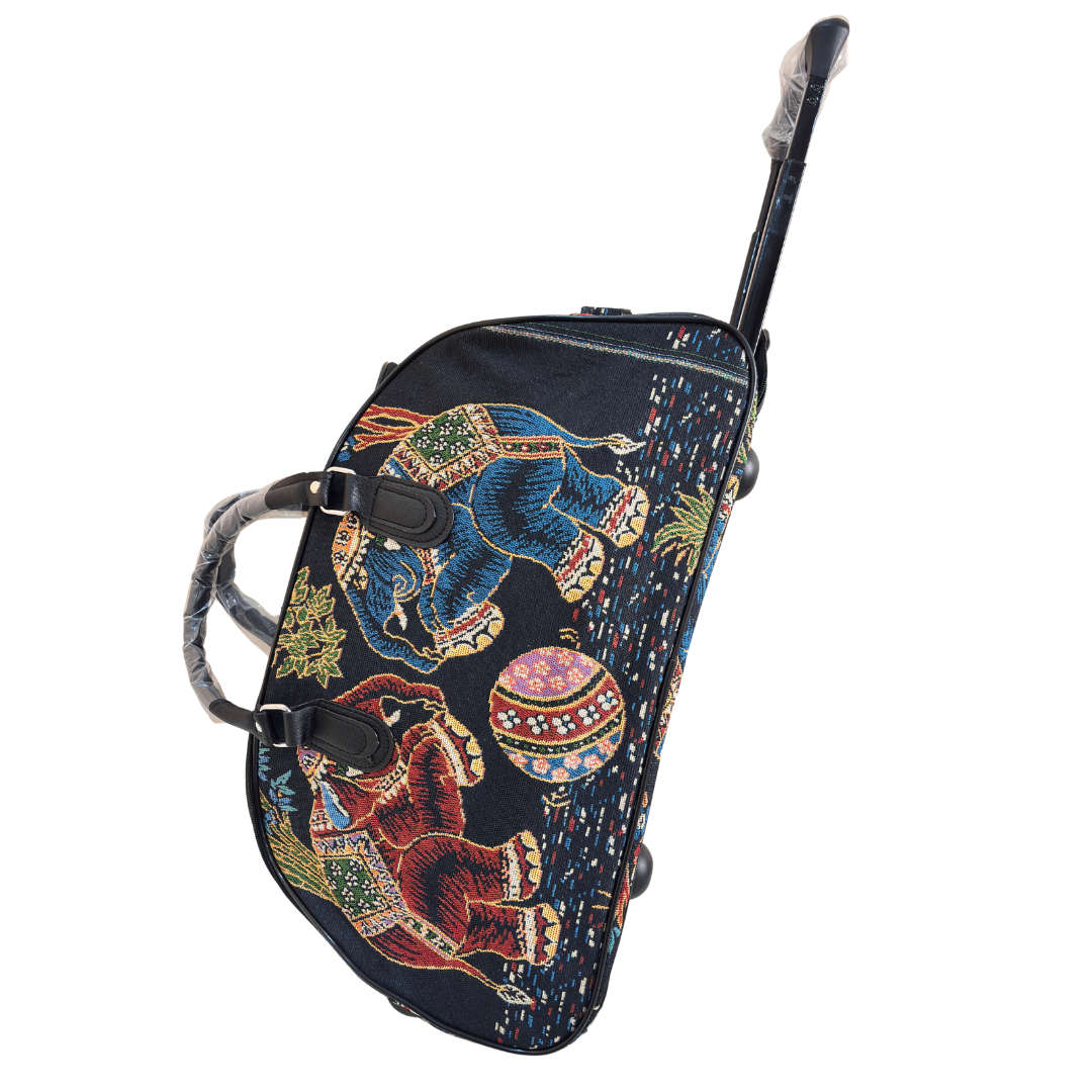 Elevate your travel experience with this stunning wheel duffle bag crafted from durable canvas fabric. Featuring a vibrant red hue adorned with an intricate elephant print, this bag exudes Indian charm and sophistication. Measuring 20 x 12 x 9 inches, it offers ample space for your essentials while remaining compact and easy to maneuver. The water-resistant construction safeguards your belongings from the elements, ensuring your items remain dry and protected. Two conveniently placed side zip pockets provide quick access to frequently needed items. Effortlessly glide through airports and city streets with the integrated trolley system, reducing strain on your shoulders and back. This versatile duffle bag is the perfect companion for your next adventure, combining style, functionality, and a touch of cultural elegance.