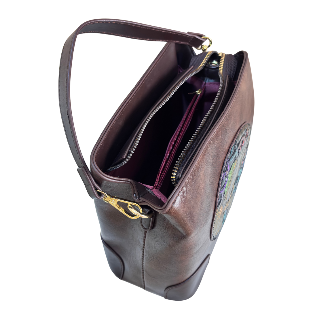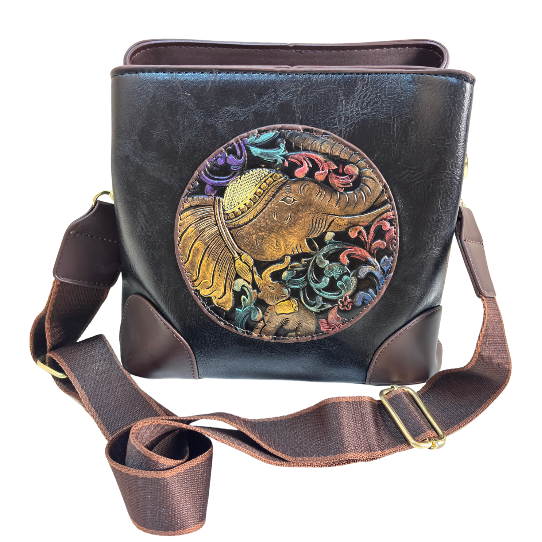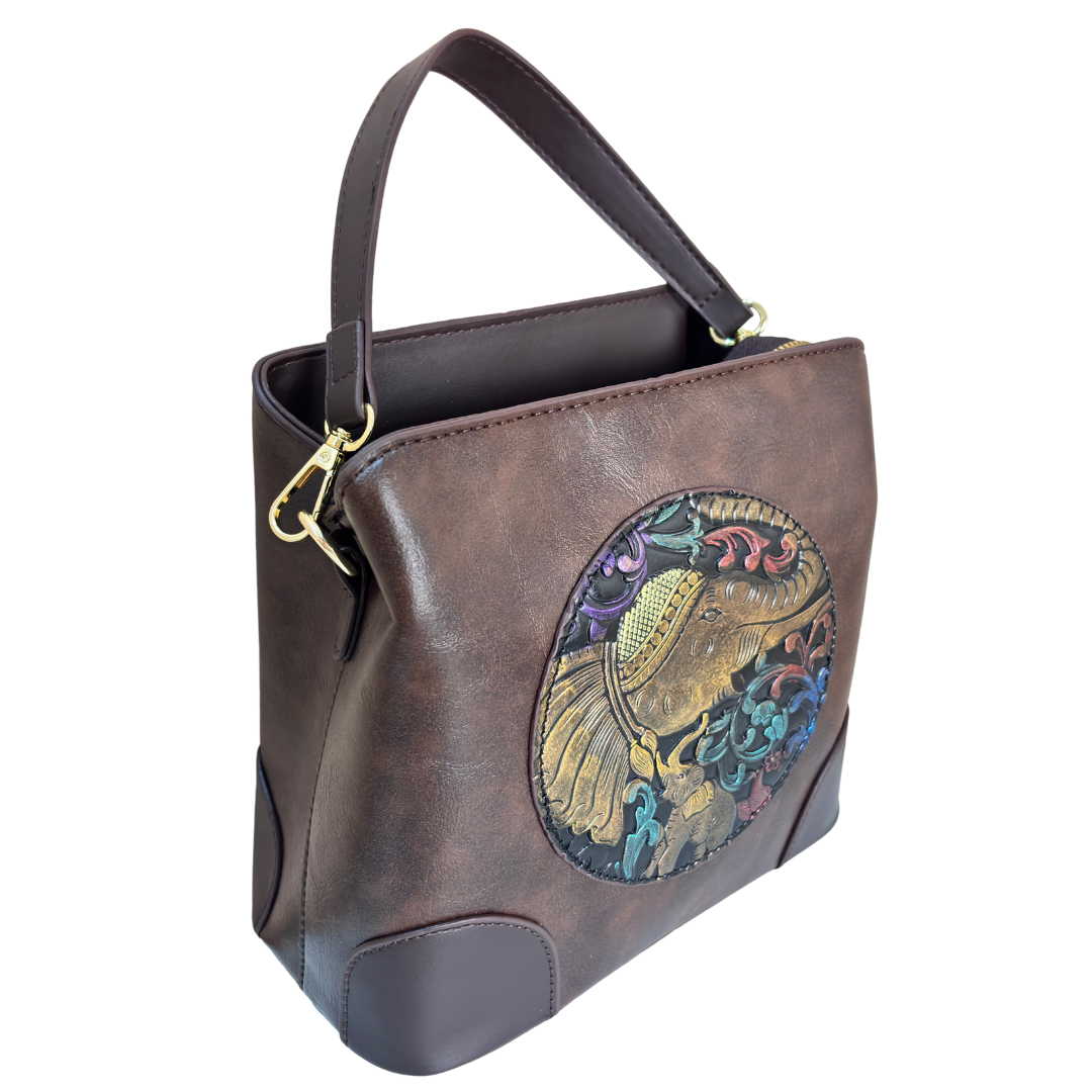 Handcrafted Design: Elegant handbag featuring an intricately embossed elephant medallion with artistic details in turquoise, purple, and gold tones on rich brown background