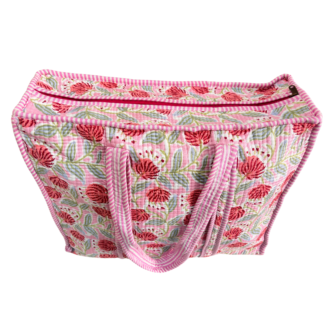 Vibrant Design: This stylish cotton quilted tote bag travel pouch features a lively tropical print with colourful illustrations of flamingos, leopards, and exotic flora.