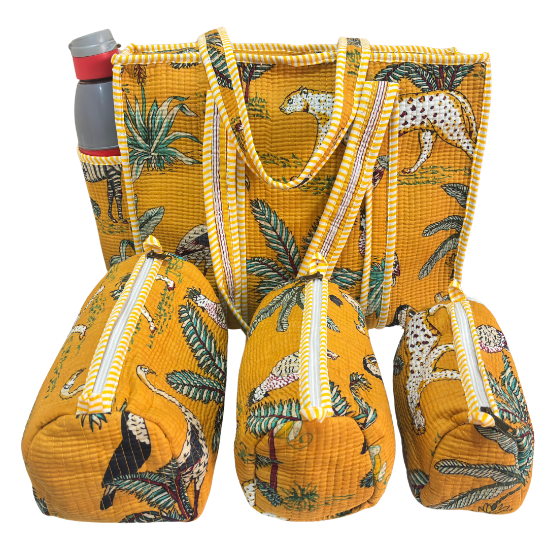 1 Premium Cotton Quilted Tote - Your sturdy daily companion & 3 Waterproof Travel Pouches (Large + Medium + Small) - Your mess-proof organizers