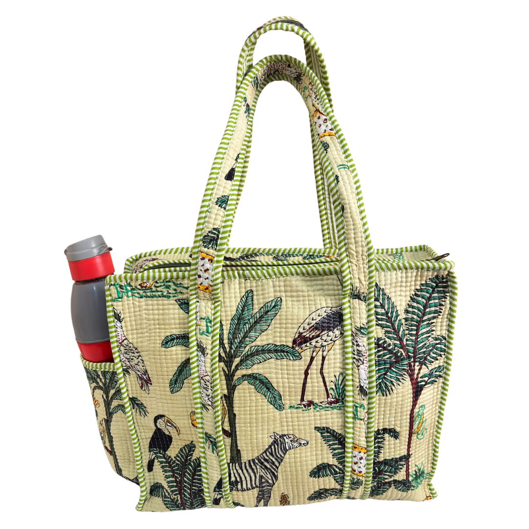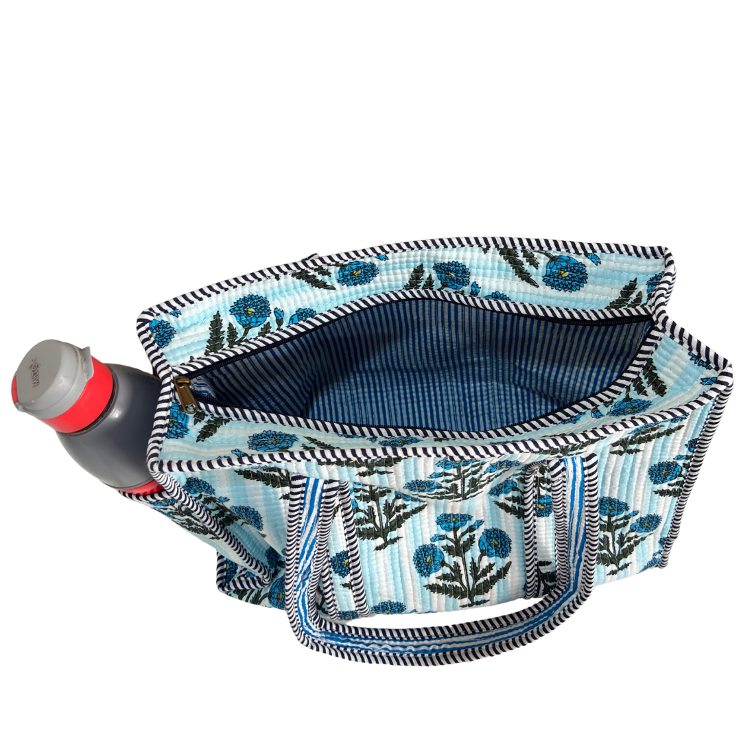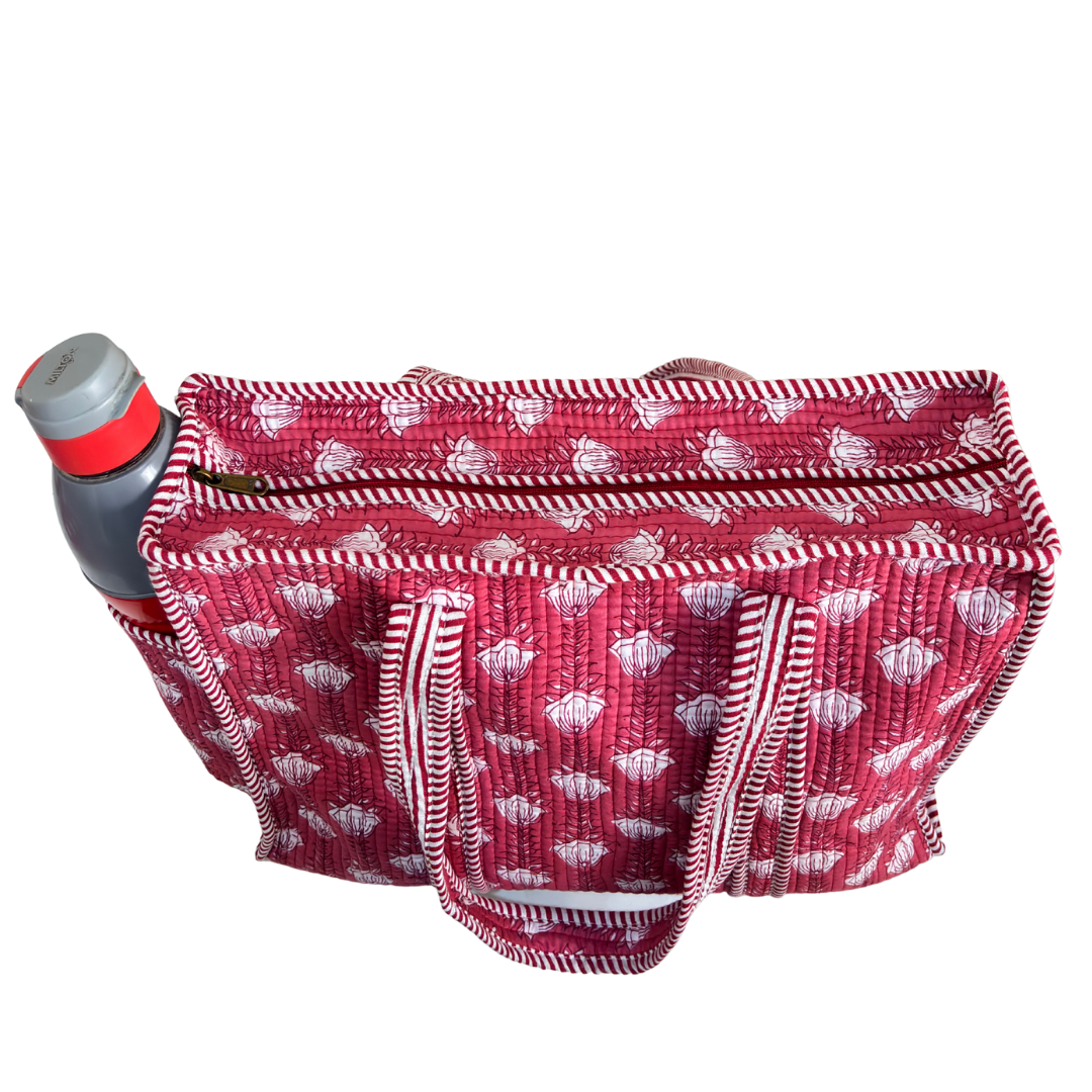 Vibrant Design: Beautiful floral quilted cotton tote bag with striped trim detailing and convenient external bottle pocket for easy access