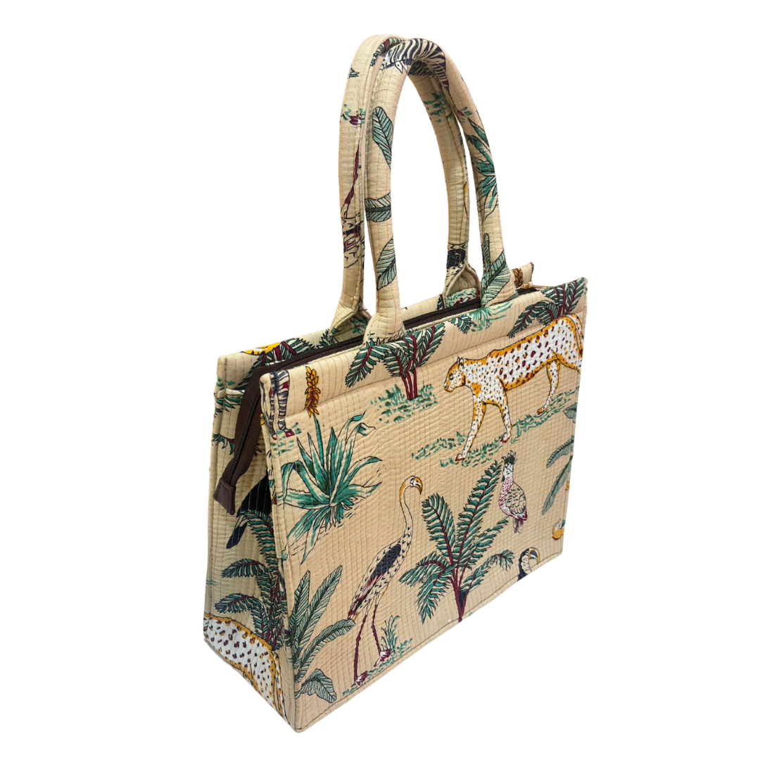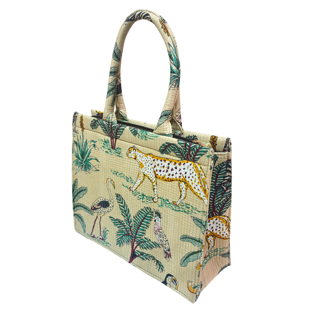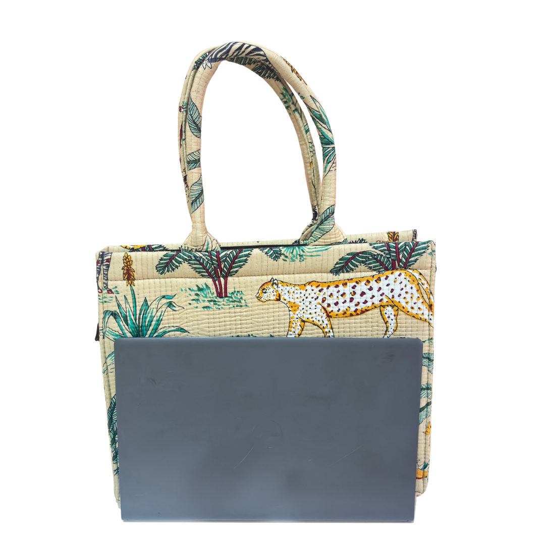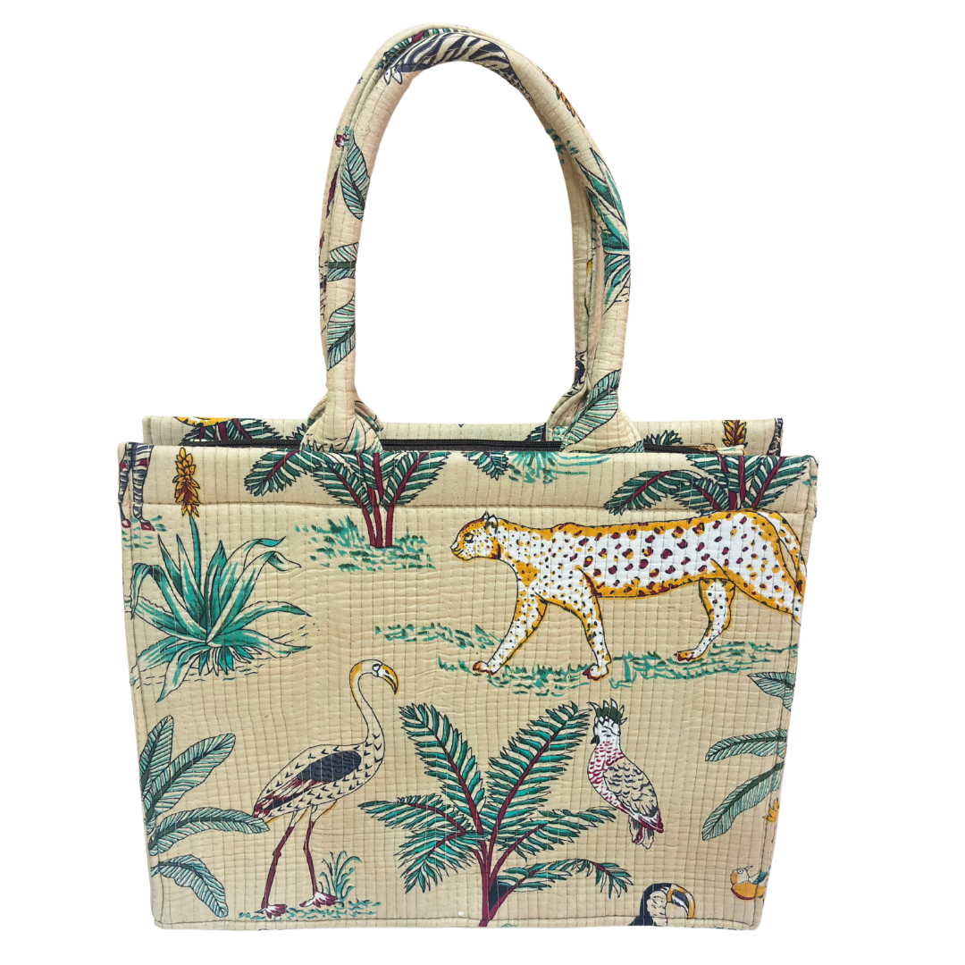Stylish Design: This quilted tote bag features a striking black animal print pattern with white and golden accents, adding a touch of sophistication to your everyday look.